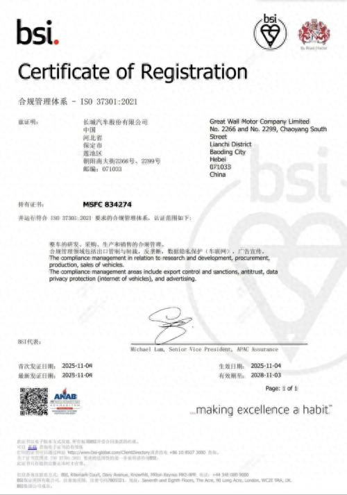 被誉为寰球“圭臬之源”的BSI的认证一直以严苛著称,本次认证隐蔽长城汽车研发、制造、采购与销售全业务历程,涵盖出口管制与经济制裁、车联网数据秘密保护、反把握、告白宣传四大合范例围。长城汽车或者在这么的评审下得回精熟收获,畸形于赢得了一张群众市集粗造相信的“通行证”。